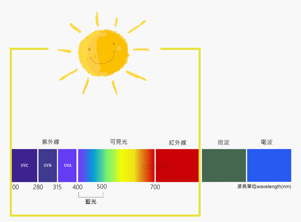 不同波長從紫外線0-400nm到可見光400-700nm以至於紅外線700nm以上